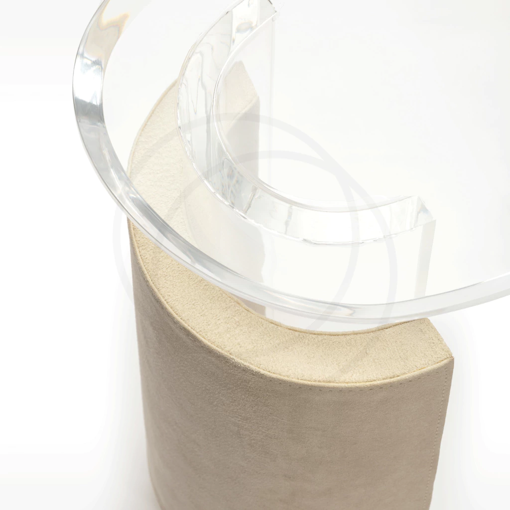 Os bancos da coleção que podem também ser utilizados como mesa de apoio, assim como as outras peças da linha, traz um design marcante com suas linhas delimitadas e esculpidas em acrílico trazendo a camurça, como o contraponto perfeito harmonizando a leveza do acrílico com a personalidade marcante da camurça. Individual ou em conjunto, um objeto que se conecta com seu contexto.