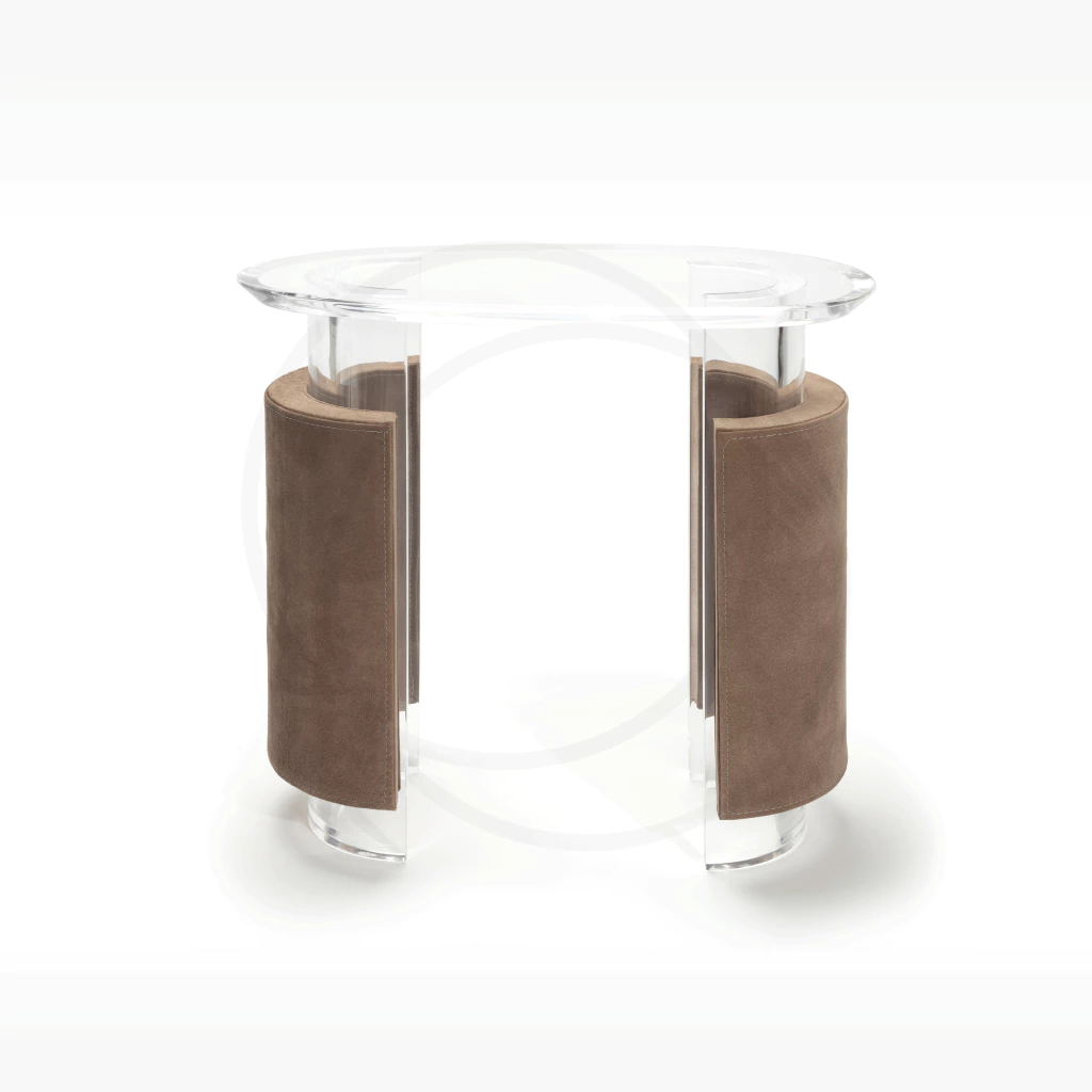 Os bancos da coleção que podem também ser utilizados como mesa de apoio, assim como as outras peças da linha, traz um design marcante com suas linhas delimitadas e esculpidas em acrílico trazendo a camurça, como o contraponto perfeito harmonizando a leveza do acrílico com a personalidade marcante da camurça. Individual ou em conjunto, um objeto que se conecta com seu contexto.