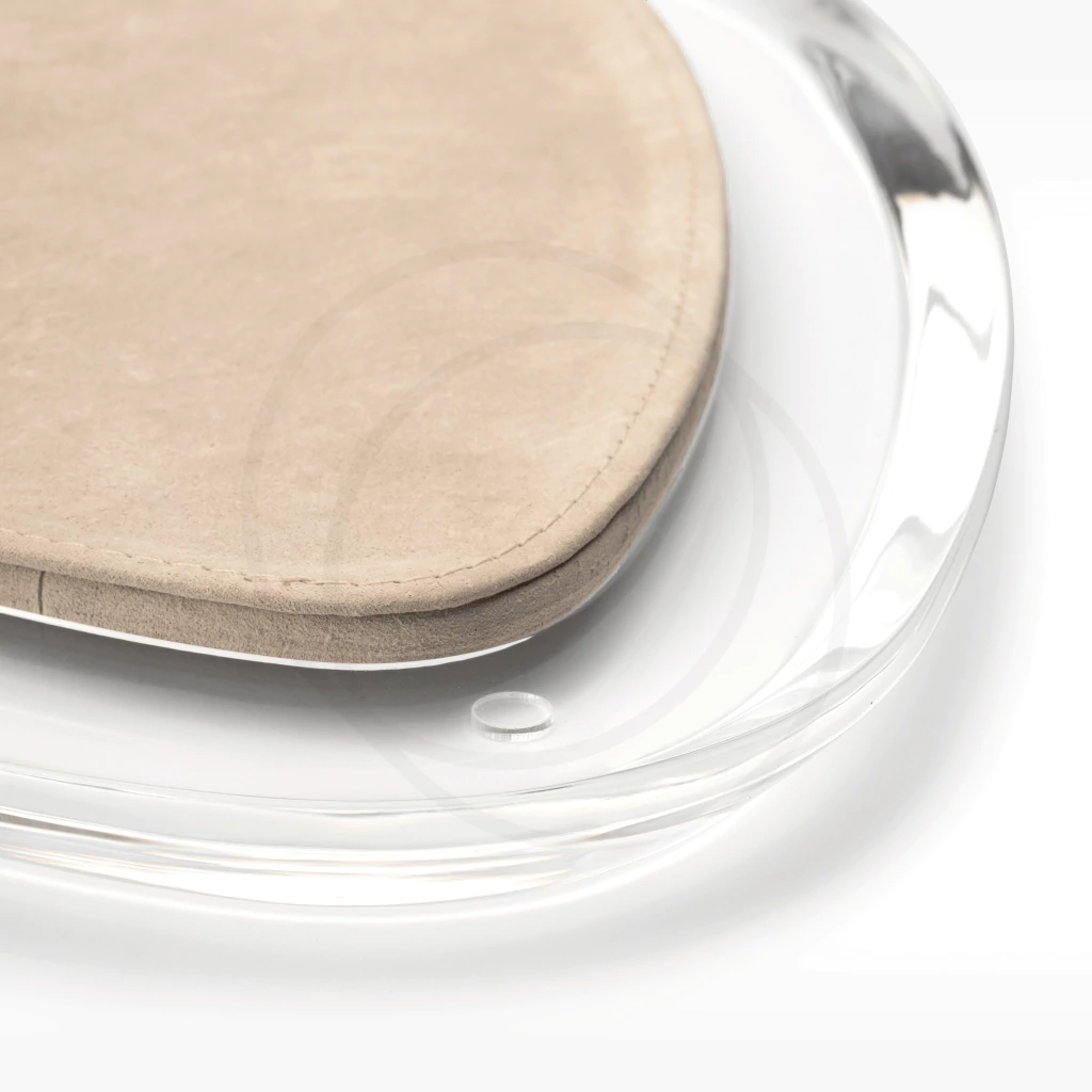 Das mesas de centro Aurora, originou-se as bases, que quando dispostas em conjunto, encaixam entre si, e formam uma composição belíssima em sua décor. Tomada como forma pura, seu design é marcante com suas linhas delimitadas e esculpidas em acrílico trazendo a camurça, como o contraponto perfeito harmonizando a leveza do acrílico com a personalidade marcante da camurça.