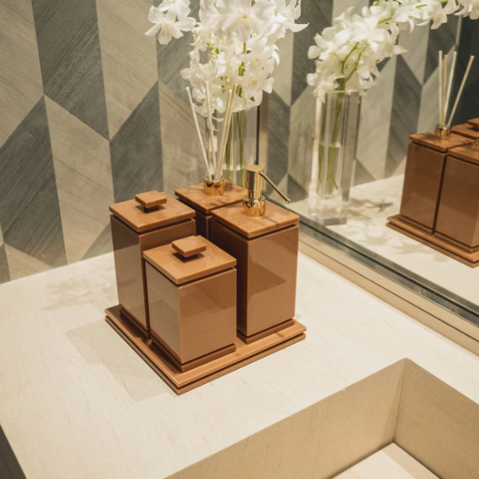 A base acomoda com elegância seus itens de lavabo, como dispensadores e difusores. Além de organizar e proteger a bancada, ela valoriza a decoração com seu design refinado e acabamento impecável.