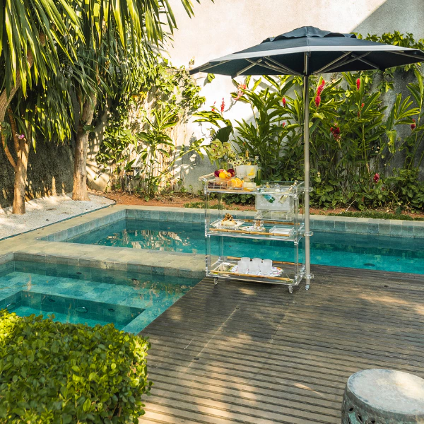 O design elegante do carrinho conta com três espaços para dispor suas bebidas e aperitivos, permitindo que você sirva com facilidade. O cooler integrado, perfeito para manter suas bebidas sempre geladas, garante que seus convidados desfrutem de refrescos em qualquer ocasião. Completo com um ombrelone que proporciona sombra e conforto, este carrinho não é apenas funcional, mas também um verdadeiro destaque em suas recepções.