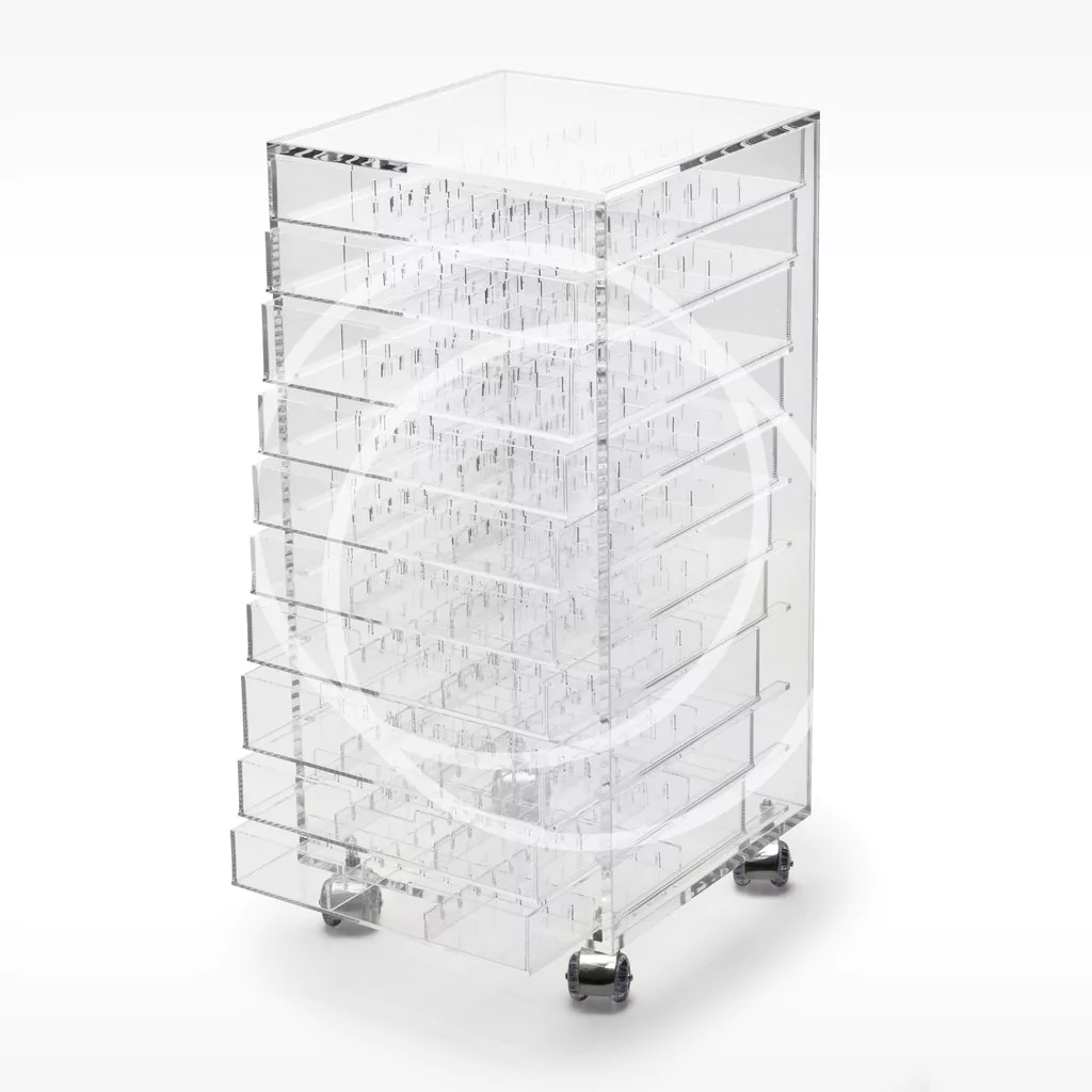 Feito todo em acrílico transparente com estrutura em 12 mm de espessura, rodízios duplos em gel e 10 gavetas.
