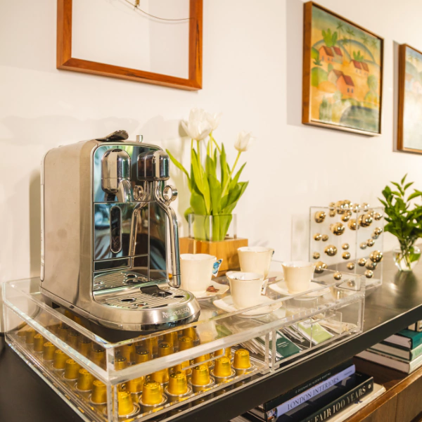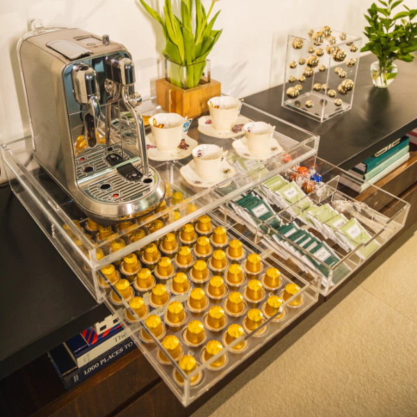 Composta por um gaveteiro e uma bandeja espaçosa, essa peça é uma excelente aposta para compor o cantinho do café ou chá, sem contar a praticidade de ter tudo à mão em único lugar. O gaveteiro comporta a organização de 54 cápsulas, facilitando a visualização de cada sabor na hora do preparo. Além disso, possui uma gaveta lateral com divisórias ajustáveis para guardar acessórios e outros condimentos, como snacks e biscoitos.