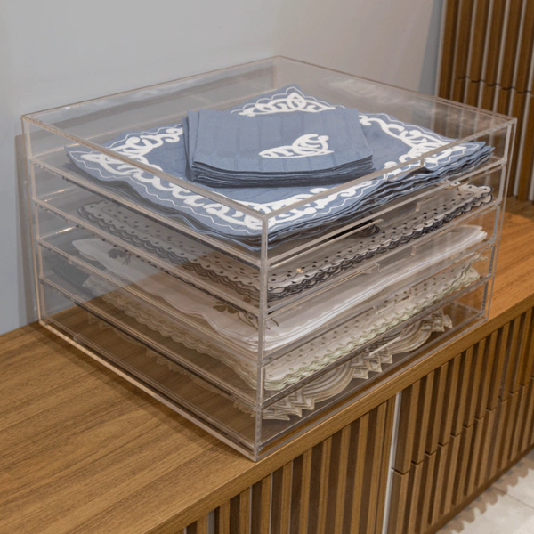 Feito todo em acrílico transparente com estrutura em 6 mm de espessura e 5 gavetas.