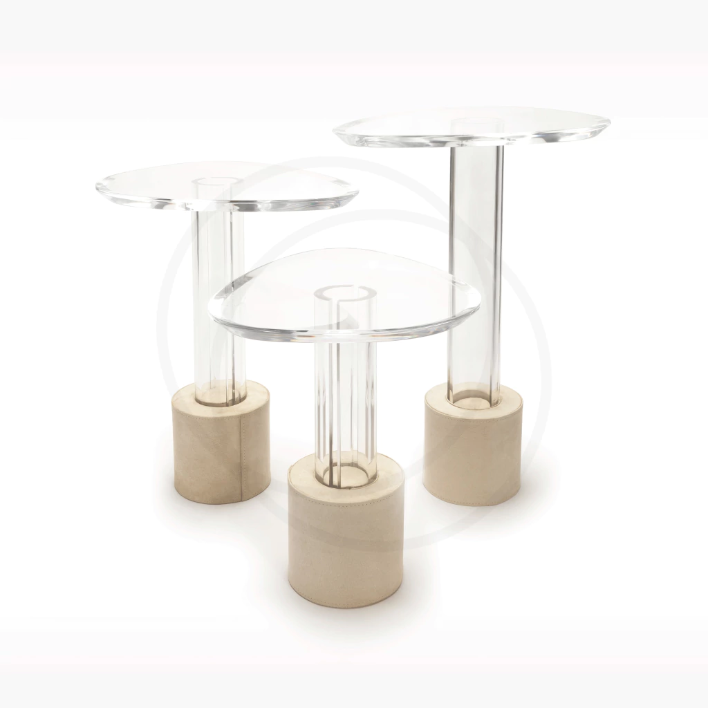 As mesas de apoio Aurora formam um conjunto versátil. Podem estar na lateral de sofás, poltronas ou mesmo nas cabeceiras de cama. Tomada como forma pura, seu design é marcante com suas linhas delimitadas e esculpidas em acrílico trazendo a camurça, como o contraponto perfeito harmonizando a leveza do acrílico com a personalidade marcante da camurça. Individual ou em conjunto, um objeto que se conecta com seu contexto.