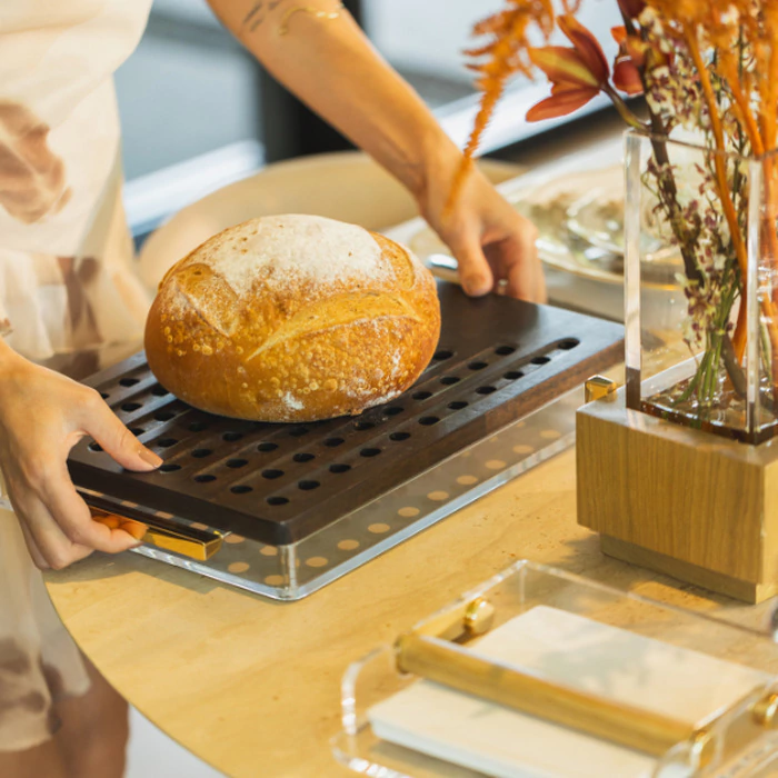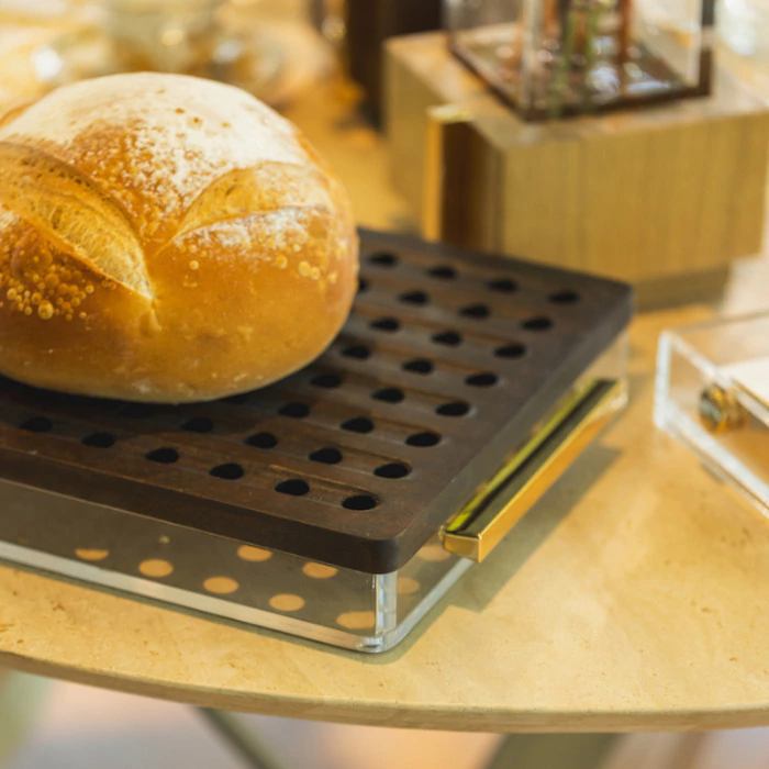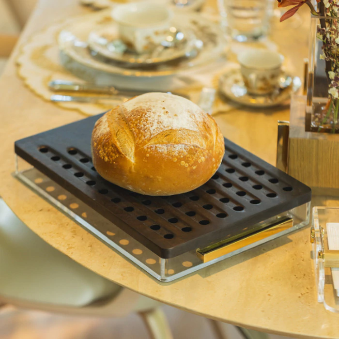 Utensílio perfeito para compor a mesa do café da manhã, unindo design à sofisticação e funcionalidade. A migalheira é ideal para o corte dos pães sobre ela, pois armazena as migalhas que caem por suas aberturas, mantendo a toalha de mesa sempre limpa.