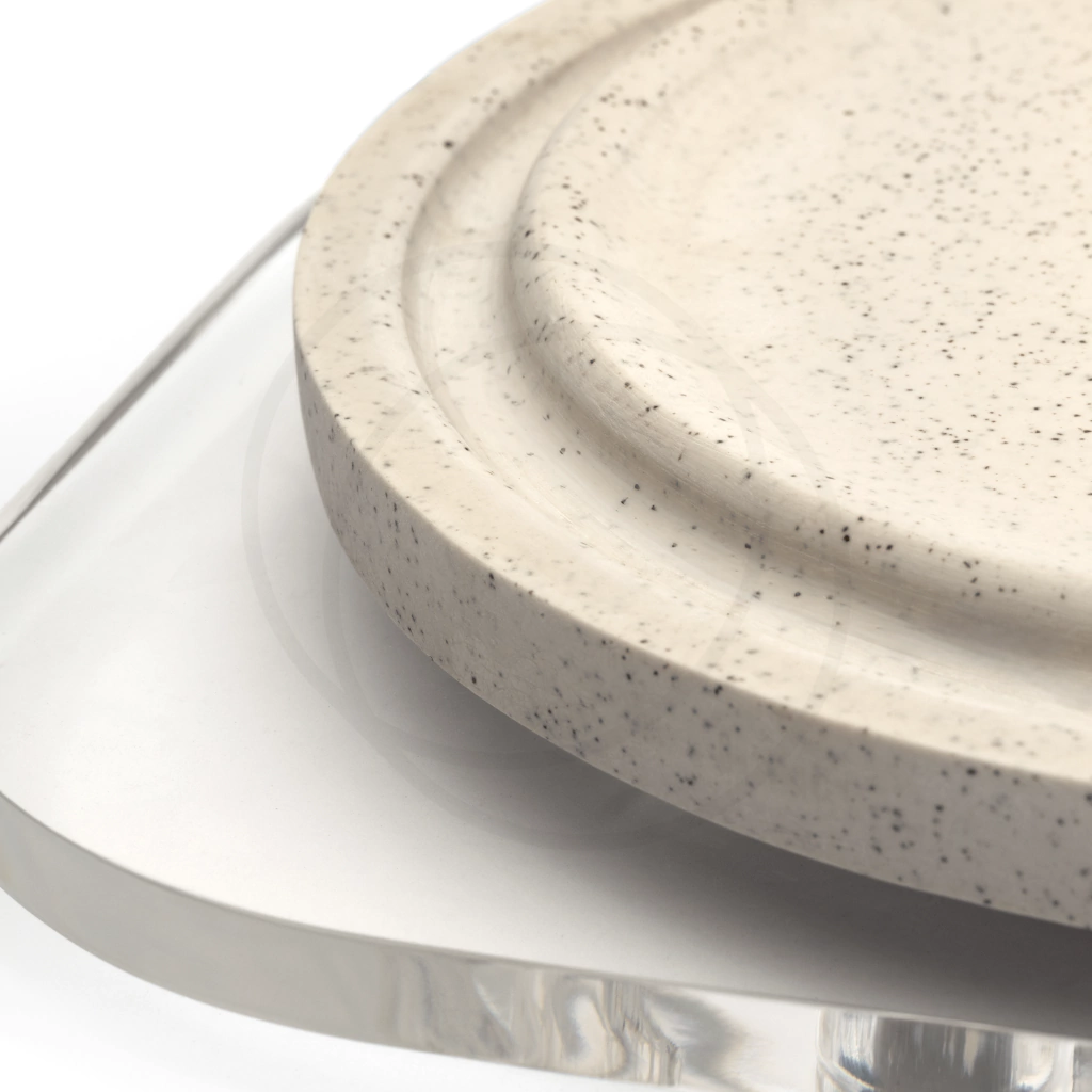 O match perfeito do Acrílico Cristal com o VogueStone, em um pantone warm gray que complementa muito bem toda a elegância de uma mesa minimalista.